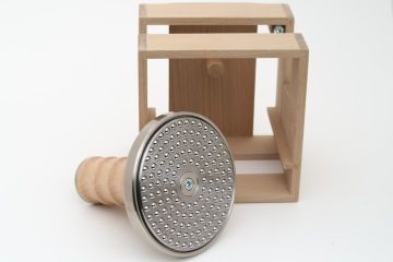 The wooden stand is an accessory for storing a Small Sláma Press. It can be assembled with a stand for the large Sláma Press. Together they can be placed on a table or hung on a wall.